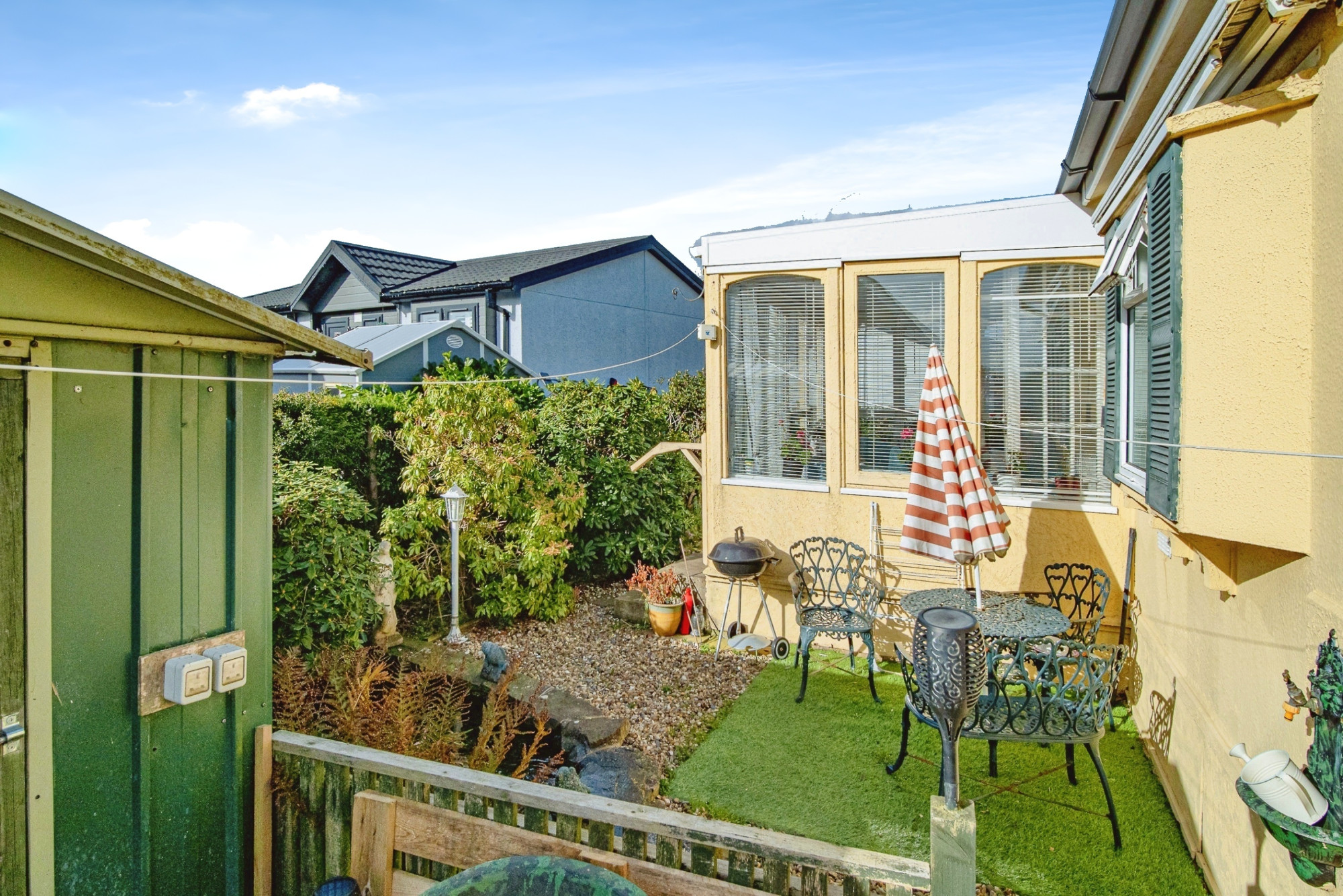 This pre-owned, well maintained (28'x20') park home is perfect for those looking for a detached, easy-to-maintain, bungalow-style property. The home has a spacious kitchen, living and dining rooms, and a conservatory leading out to the garden. There are two bedrooms, a shower room and a further storage room. The landscaped exterior boasts a private garden area with gravel and lawn areas and a pond. The home doesn't back onto the canal, but it can be seen from the home.