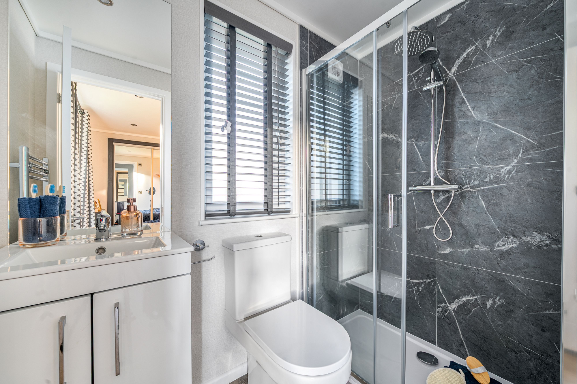 This brand-new, modern-furnished Residence (42'x20') luxury park home is perfect for those looking for a detached, easy-to-maintain, bungalow-style property. The home has a spacious kitchen with integrated appliances and an island, dining area and comfortable living area with electric fireplace. There are two double bedrooms with fitted wardrobes, an en suite and a bathroom.