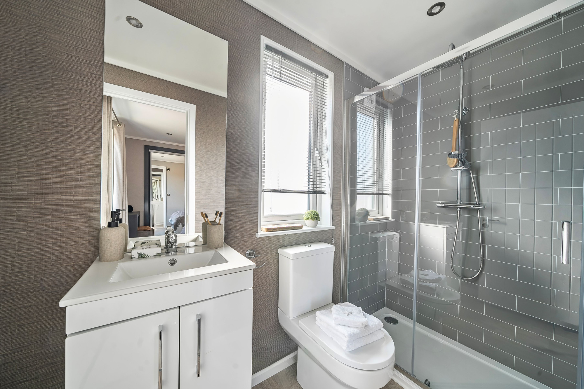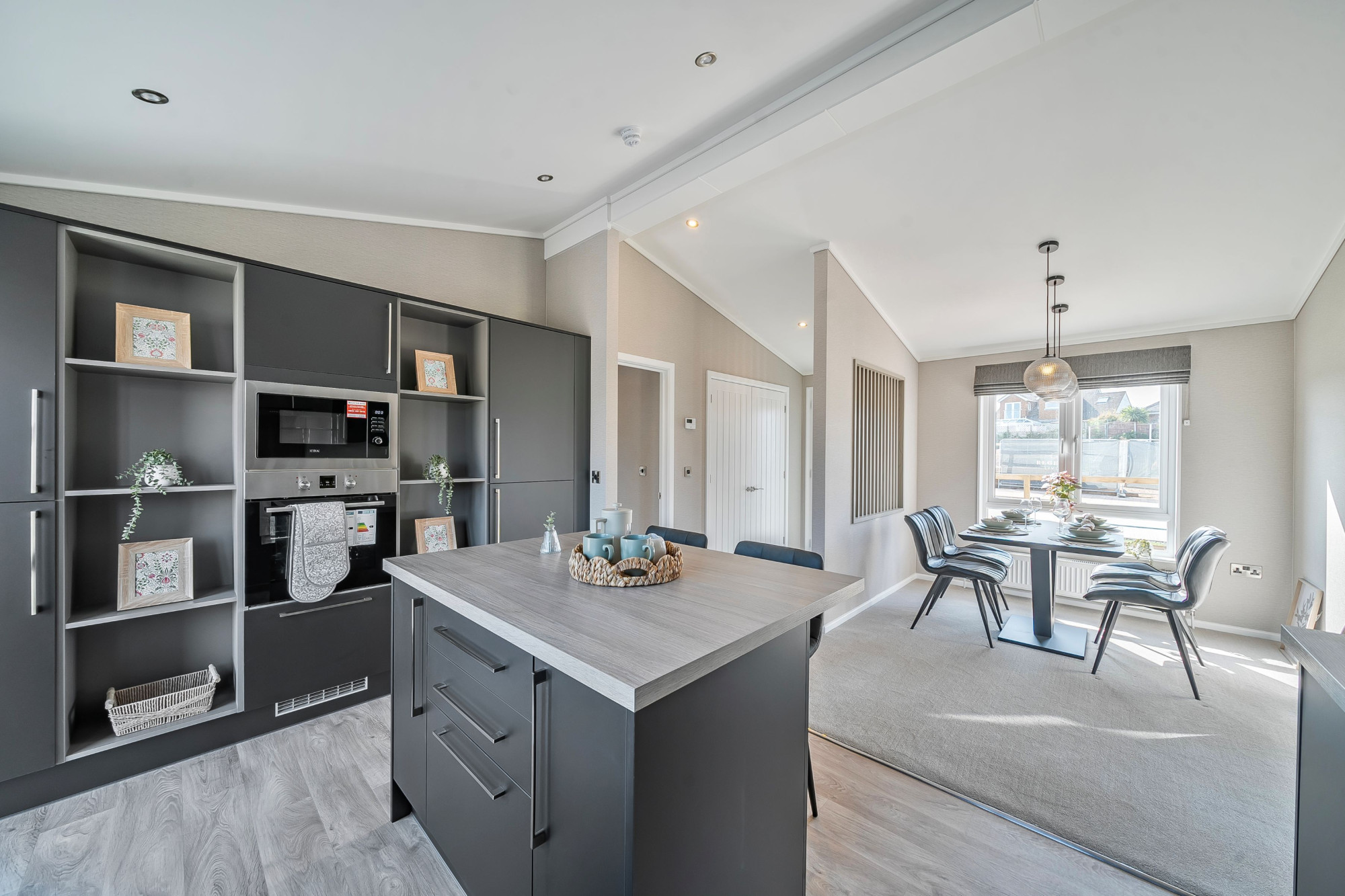 This brand-new, modern-furnished Residence (42'x22') luxury park home is perfect for those looking for a detached, easy-to-maintain, bungalow-style property. The home has a spacious kitchen with integrated appliances and an island, dining area and comfortable living area with electric fireplace. There are two double bedrooms with fitted wardrobes, an en suite and a bathroom.