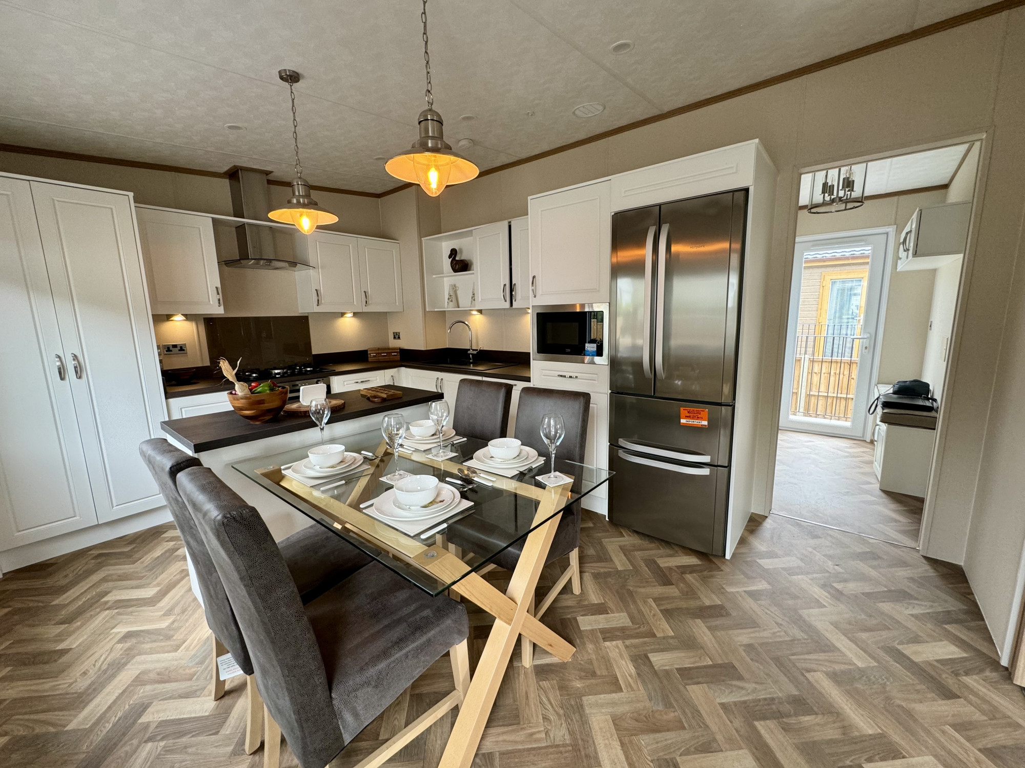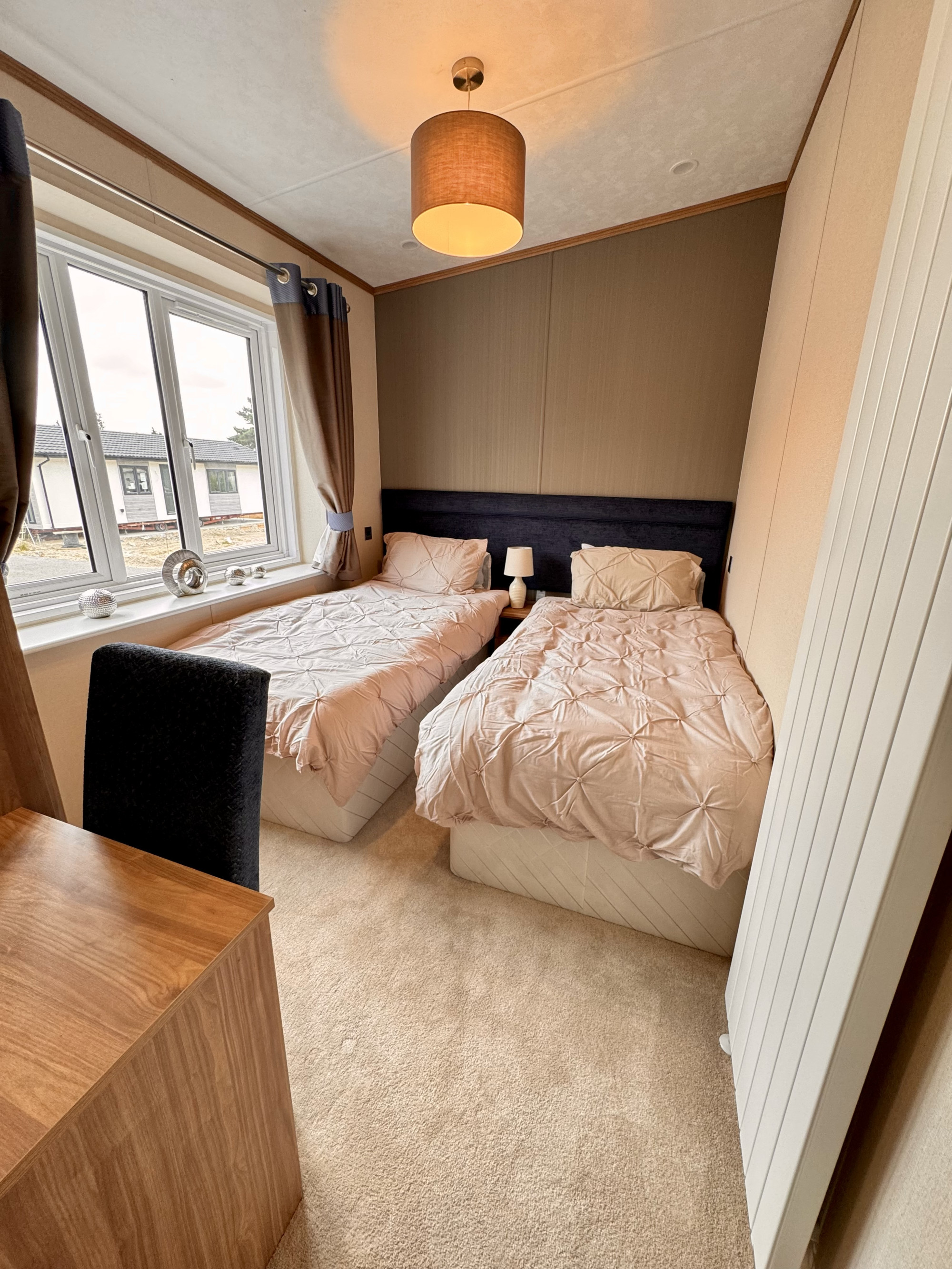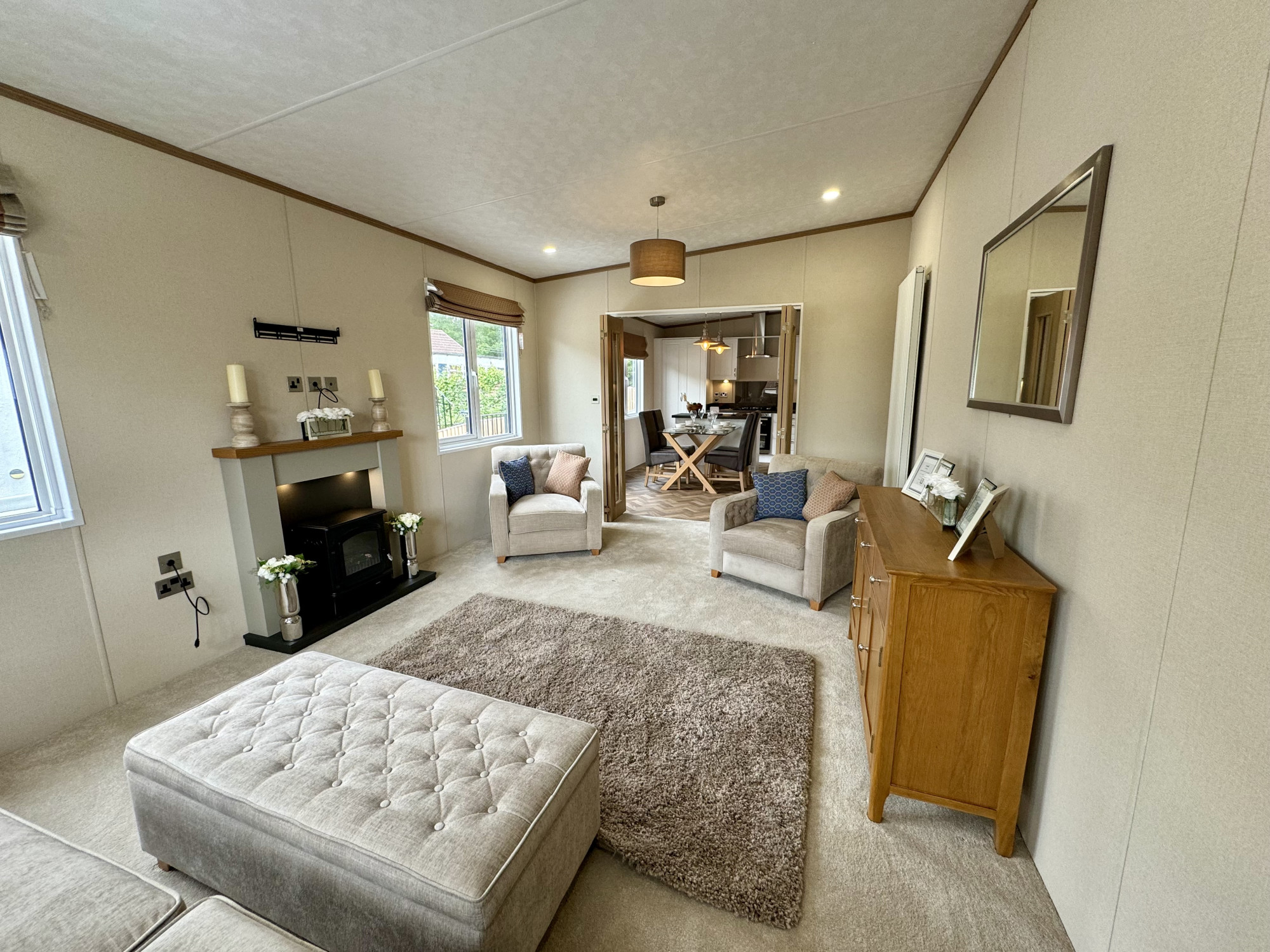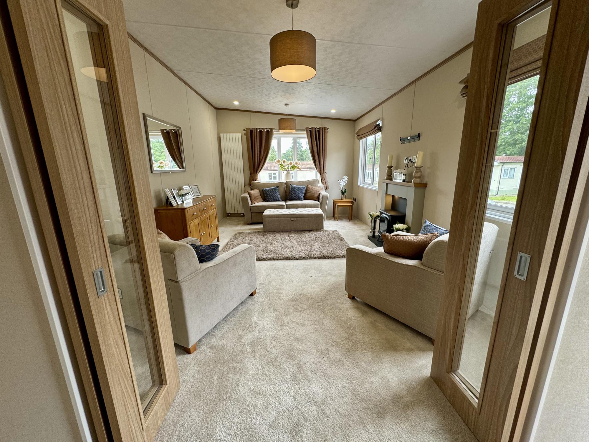 This brand-new, modern-furnished Pemberton (40'x20') luxury park home is perfect for those looking for a detached, easy-to-maintain, bungalow-style property. The home has a modern spacious kitchen with integrated appliances, a comfortable living room with an electric fireplace. The are two bedrooms, the master has built in wardrobes and an en suite, there is a second bedroom with twin beds. The exterior includes a parking space and an easy to maintain garden.