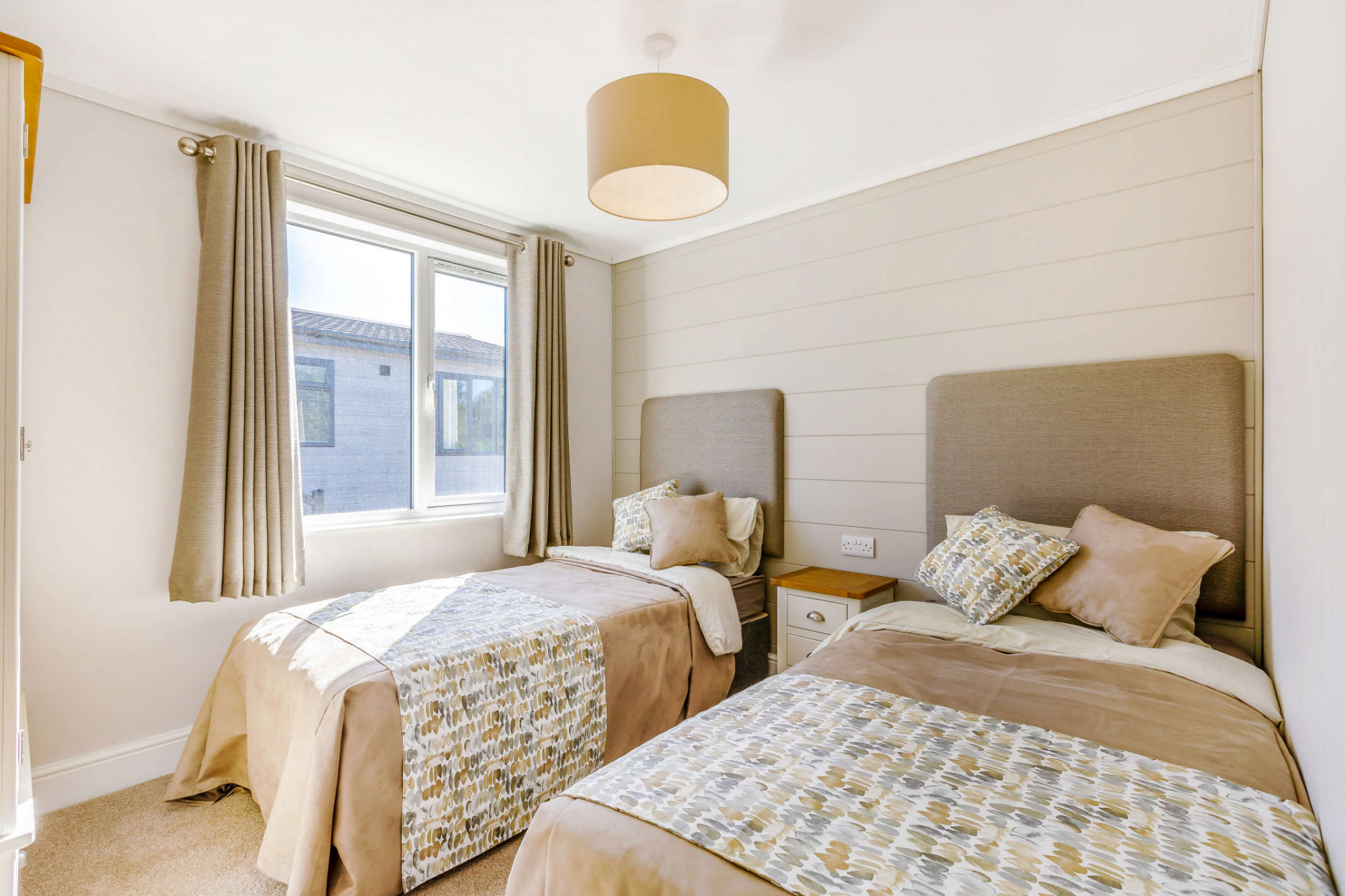 This brand new, modern-furnished Prestige Burleigh (40'x20') luxury park home is perfect for those looking for a detached, easy to maintain, bungalow-style property. The landscaped exterior boasts private driveway for 2 cars and stunning countryside views from the lounge and the wrap around decking. The home features a modern, open plan kitchen, dining and living area, decorated with warm bright colours and comfortable furniture. There are two double bedrooms, a family bathroom and an en suite.