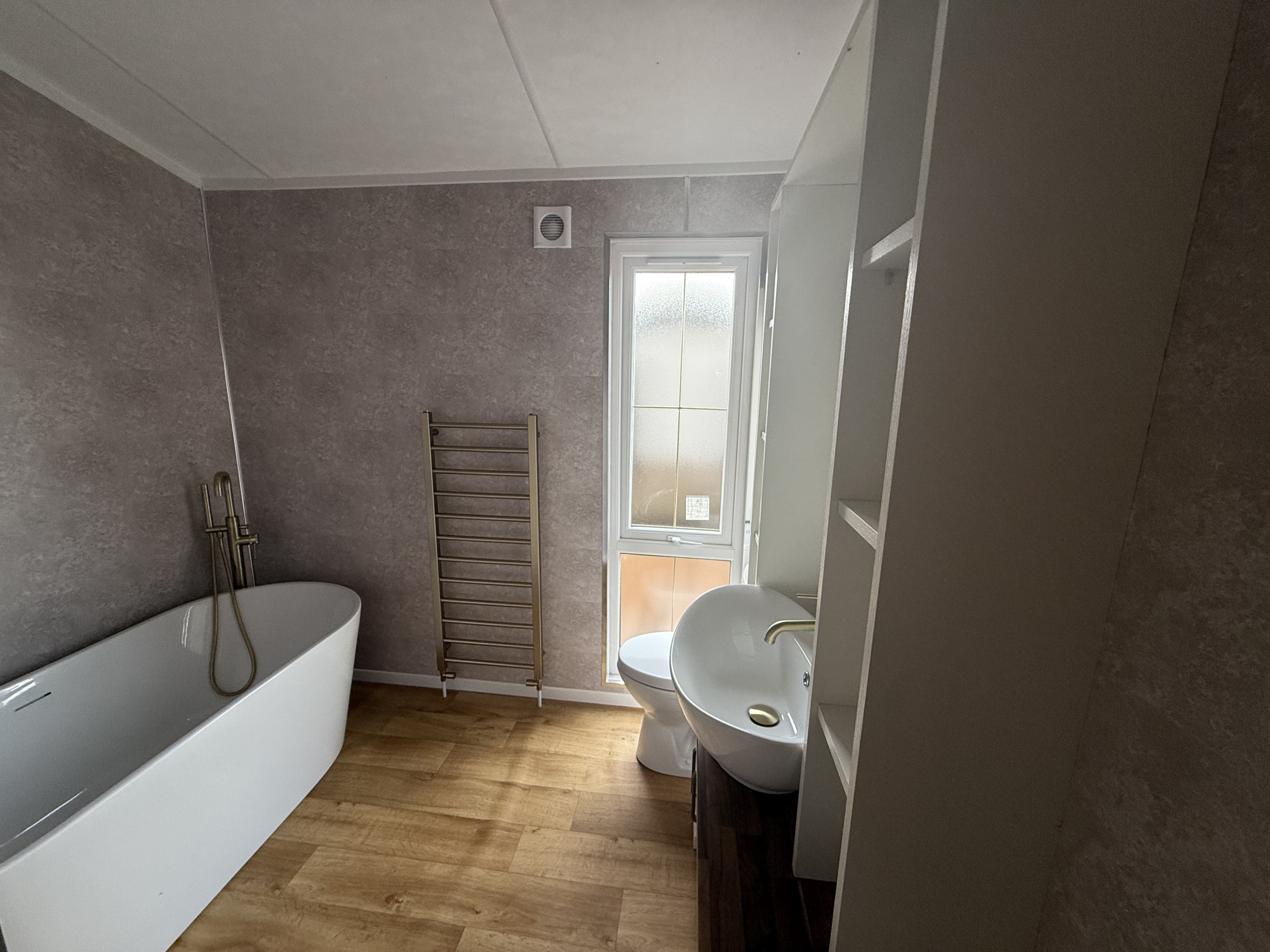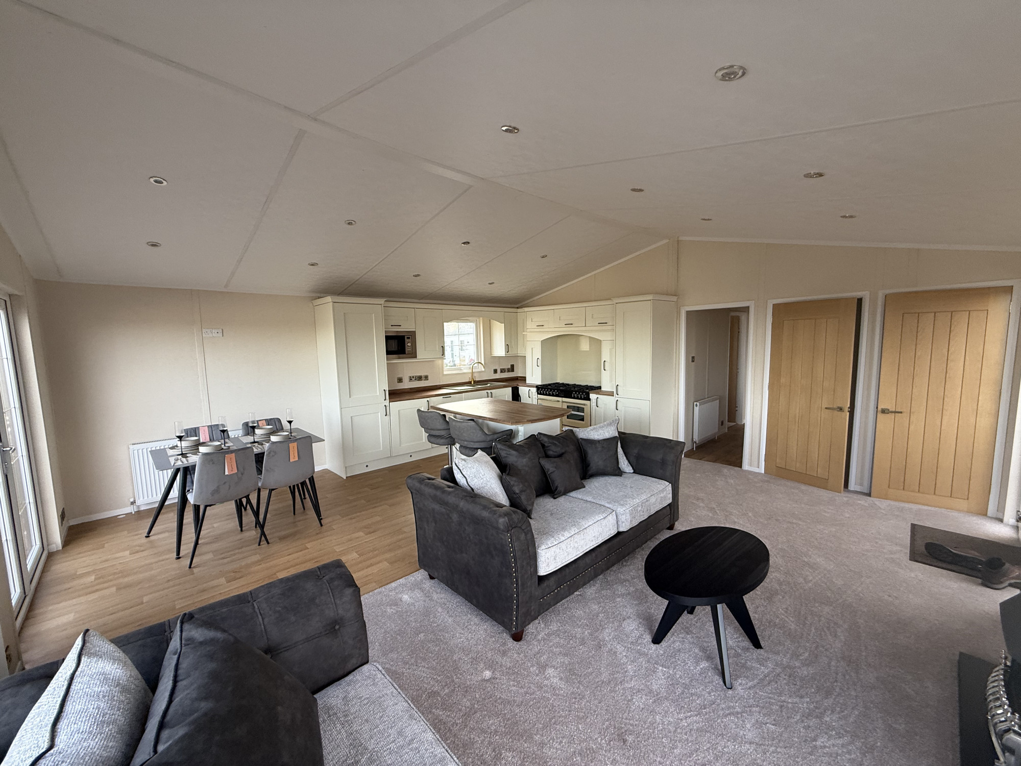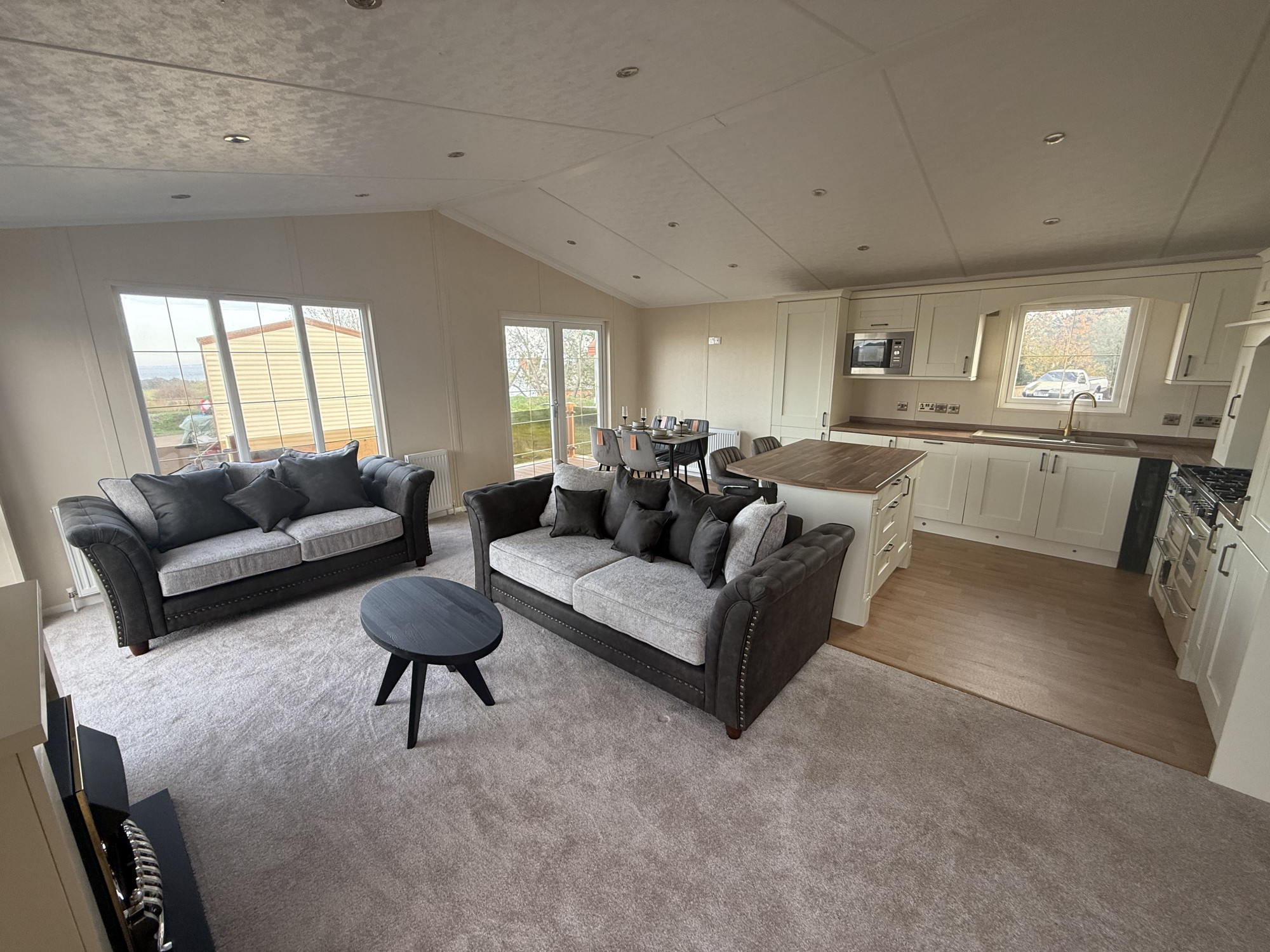This brand-new, modern-furnished luxury park home is perfect for those looking for a detached, easy-to-maintain, bungalow-style property. The home has an open plan kitchen, dining and living room. The kitchen has a large cooker, plenty of storage and an island to add extra surface space. The living area has an electric fireplace and double doors leading to a decking area that overlooks the park. There are two bedrooms, the master has a walk in wardrobe and an en suite. The lodge-style home is fully furnished with stylish beds, plush sofas and modern touches.