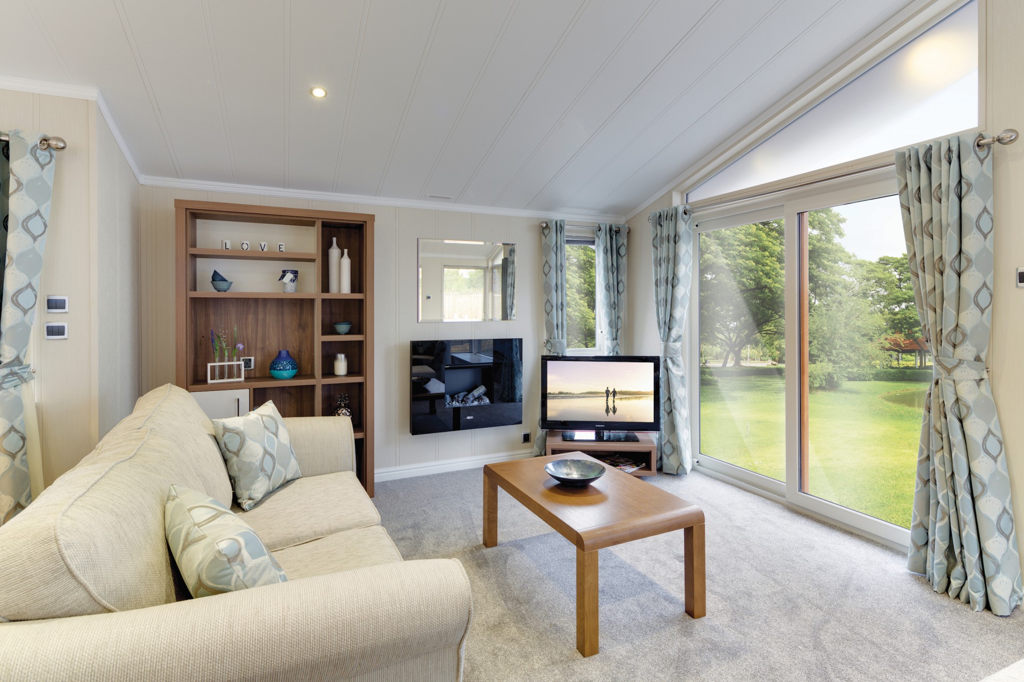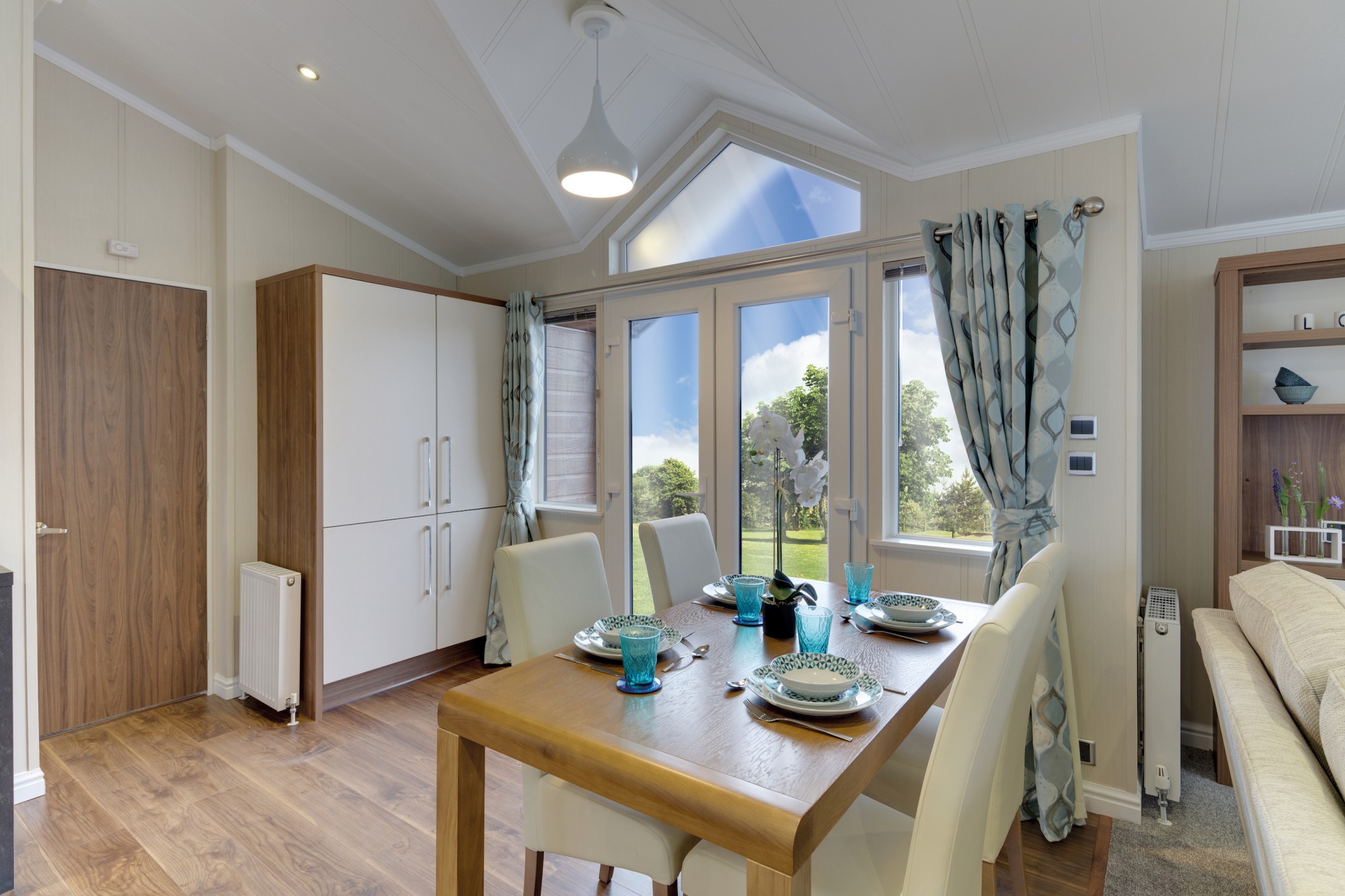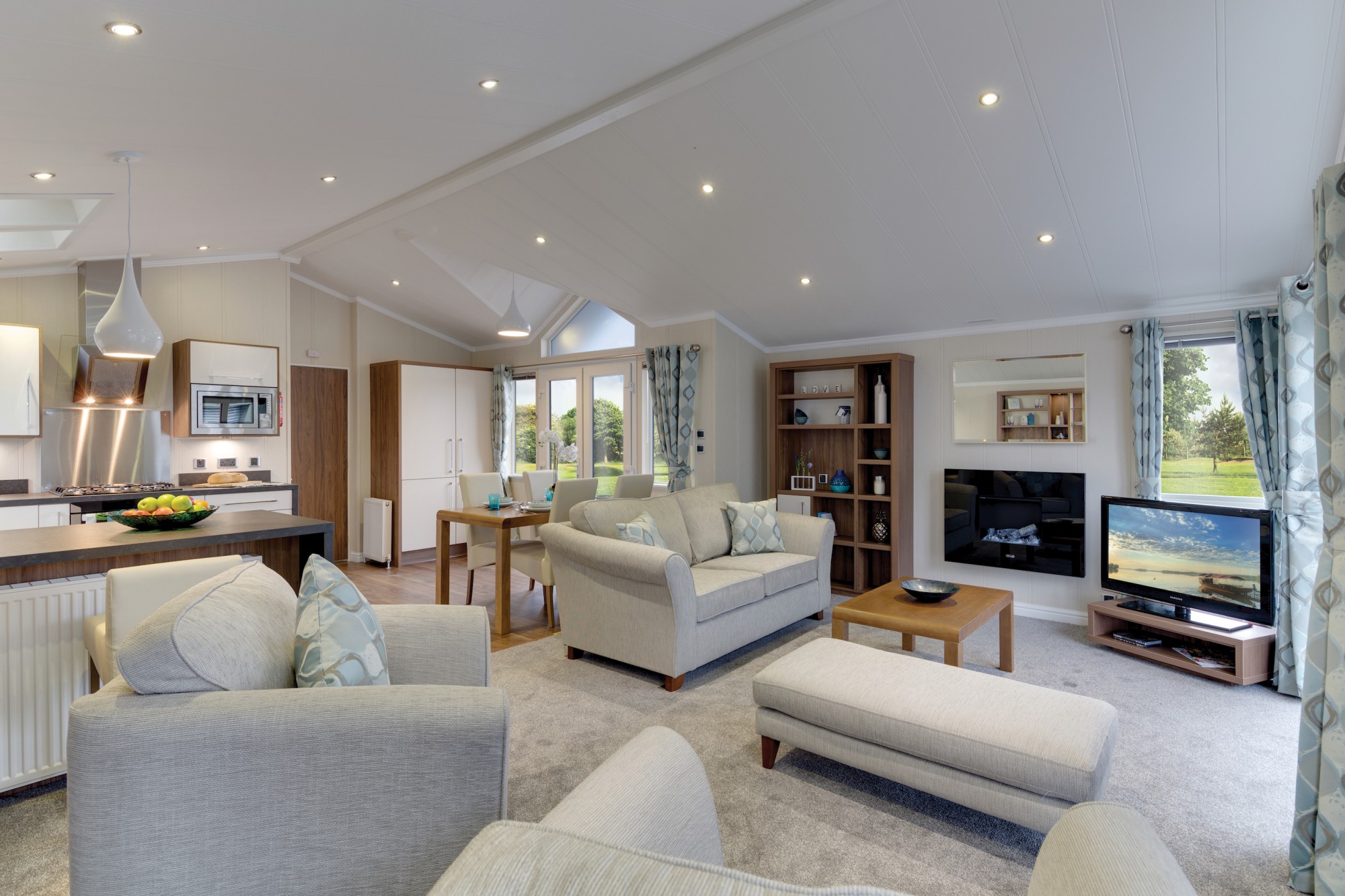 This brand new, modern-furnished Willerby New Hampshire (42'x20') luxury lodge is perfect for those looking for a detached, bungalow-style leisure property. The lodge features an open plan kitchen, living and dining area with large windows. The kitchen has modern integrated appliances with plenty of worktop space, and the living space has comfortable furniture, French doors, and an electric fireplace. There are two bedrooms, an en suite and a family bathroom.