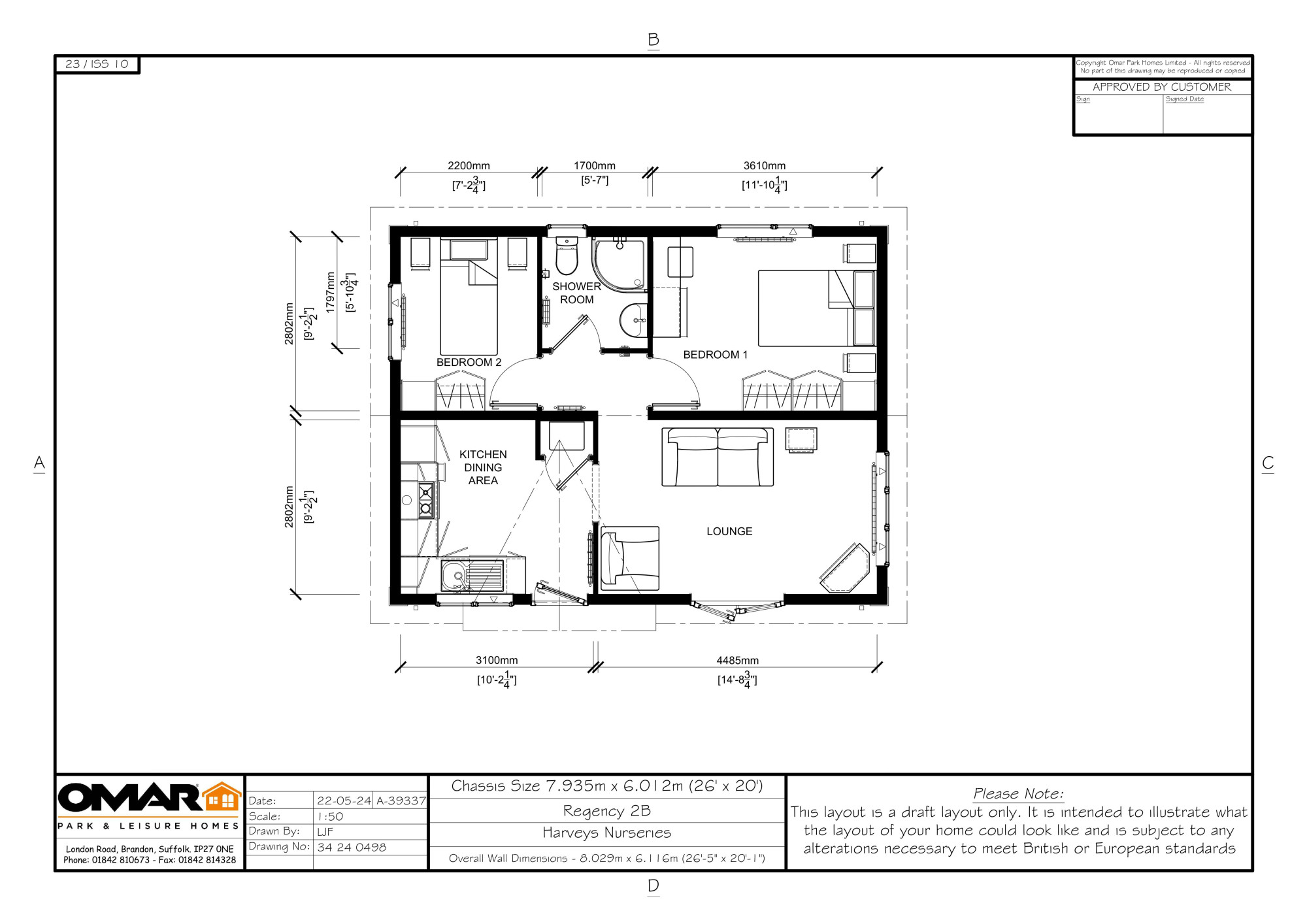 This brand-new, modern-furnished Omar Regency Bespoke (26'x20') luxury park home is perfect for those looking for a detached, easy-to-maintain, bungalow-style property. The home features a spacious kitchen and dining room, comfortable living space, two bedrooms, and a bathroom.