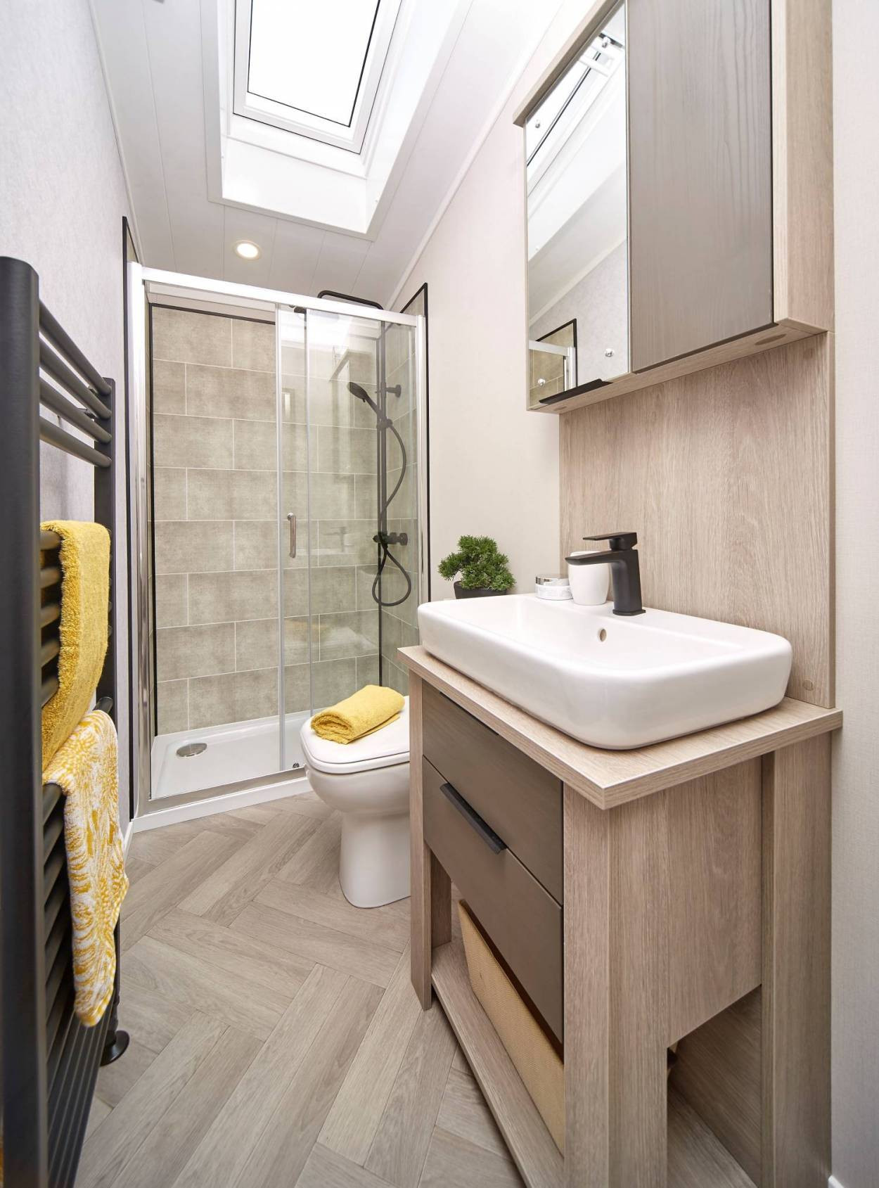 This brand new, modern-furnished Victory Lakewood (42'x14') luxury lodge is perfect for those looking for a detached, easy to maintain, bungalow-style property. The lodge features an open plan kitchen, dining room, and living room with a fireplace, two bedrooms, an en suite and a bathroom.