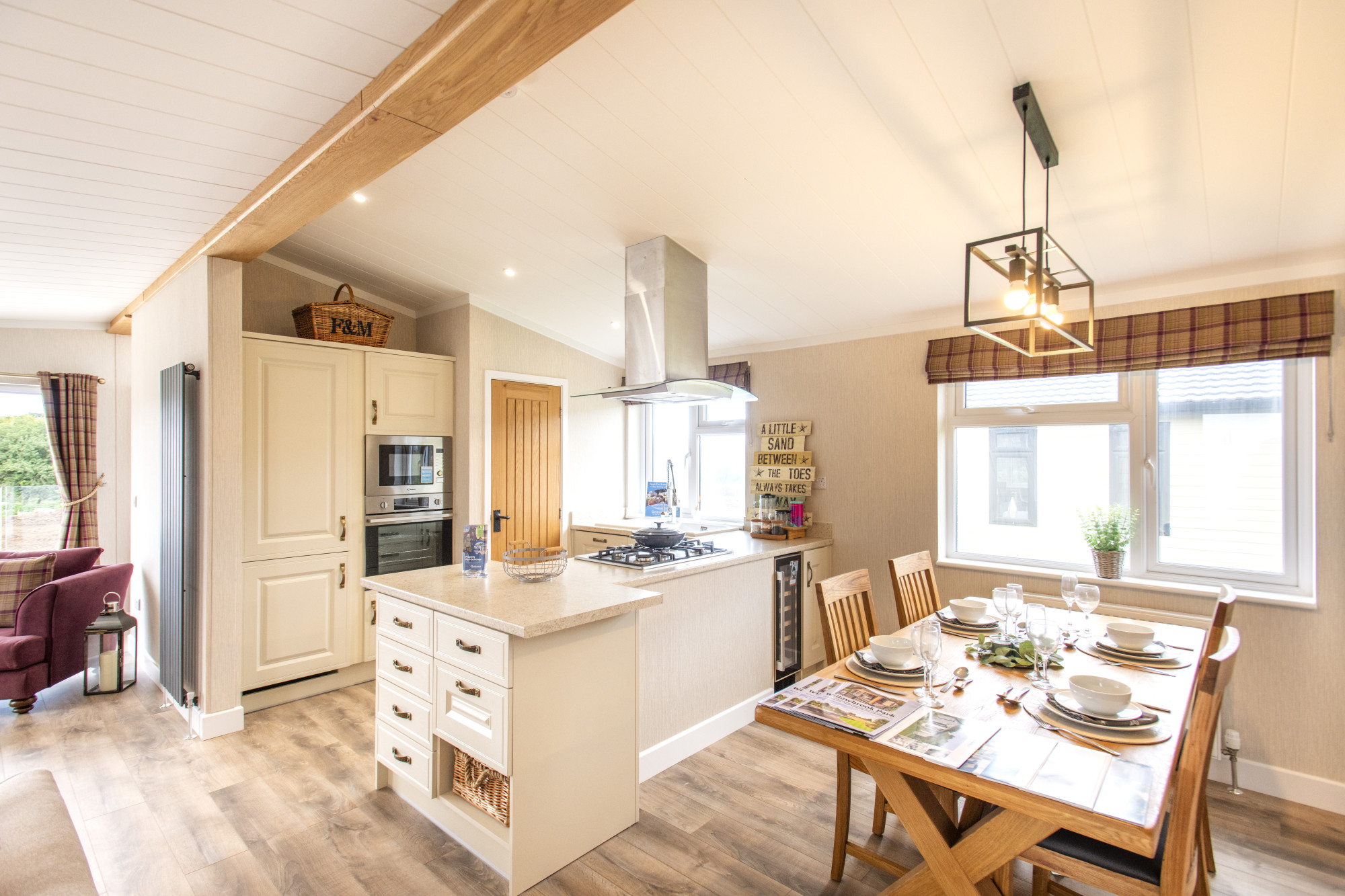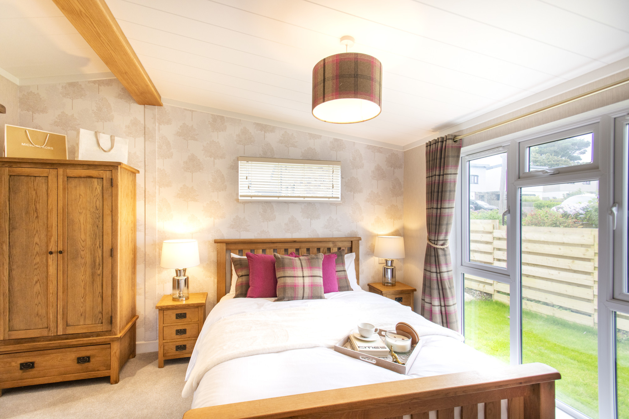 This brand new, modern-furnished Omar Allure (45'x20') luxury park home is perfect for those looking for a detached, easy to maintain, bungalow-style property. The home features and open plan living space with a spacious kitchen with integrated appliances, an island and a dining area. The living area features an electric fireplace and large windows and French doors leading to the patio. The master bedroom has an en suite and and there is a second double bedroom and a bathroom.
