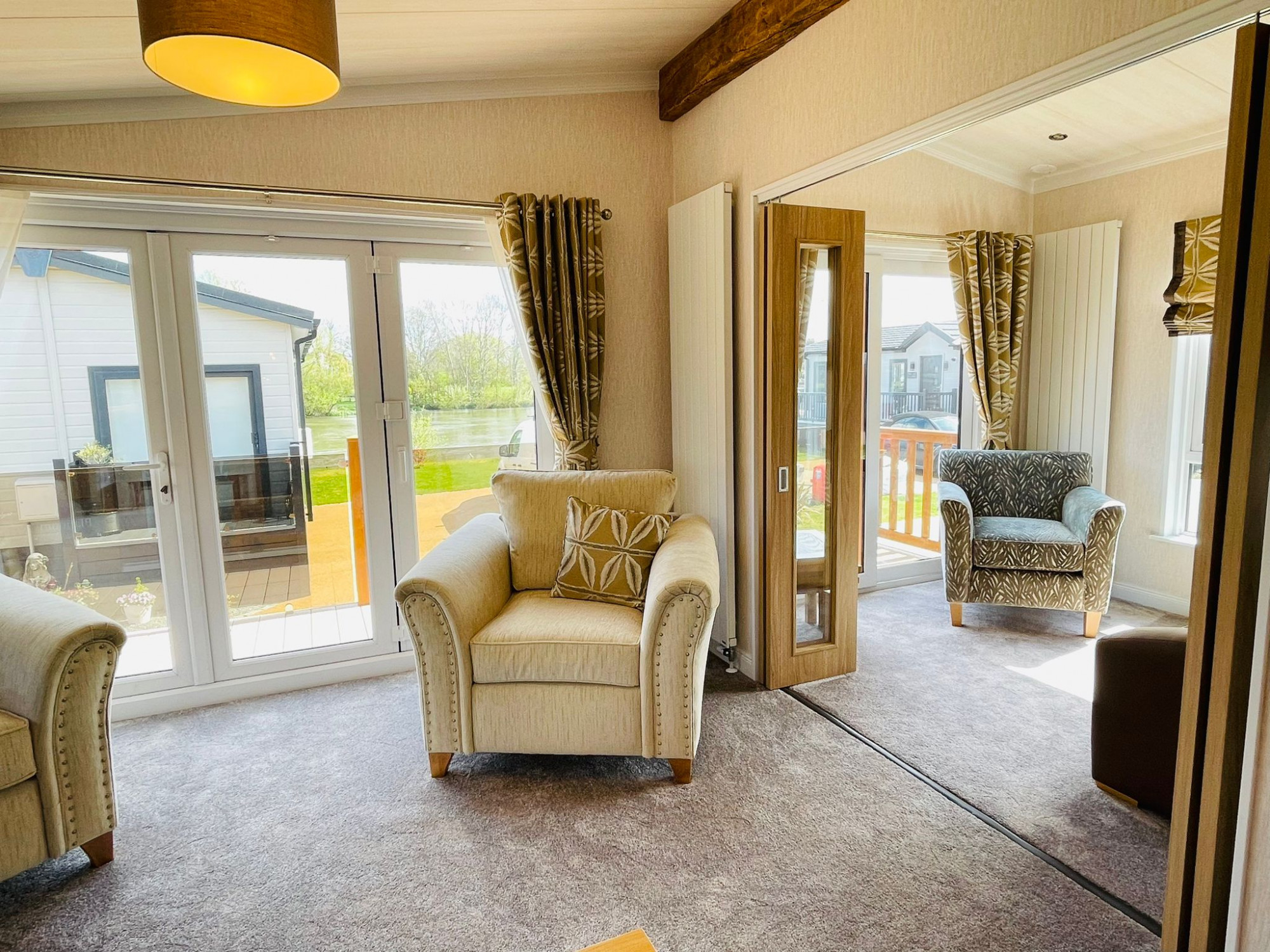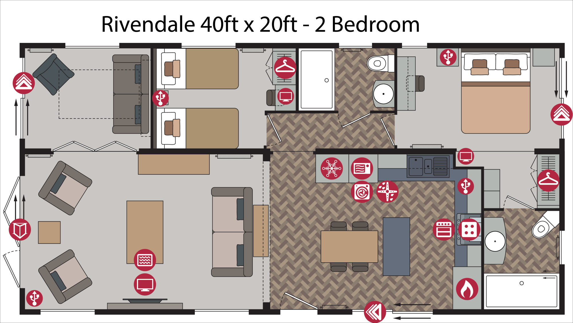 This brand new, fully-furnished Pemberton Rivendale (40'x20') a luxury park home is perfect for those looking for a detached, easy to maintain, bungalow-style retirement property. This is a modern styled park home with a traditional exterior and beautiful interior design. The open plan kitchen area features integrated appliances including, the living room features a plush lounge suite, and large windows. There are two double bedrooms, an en suite and a family bathroom.