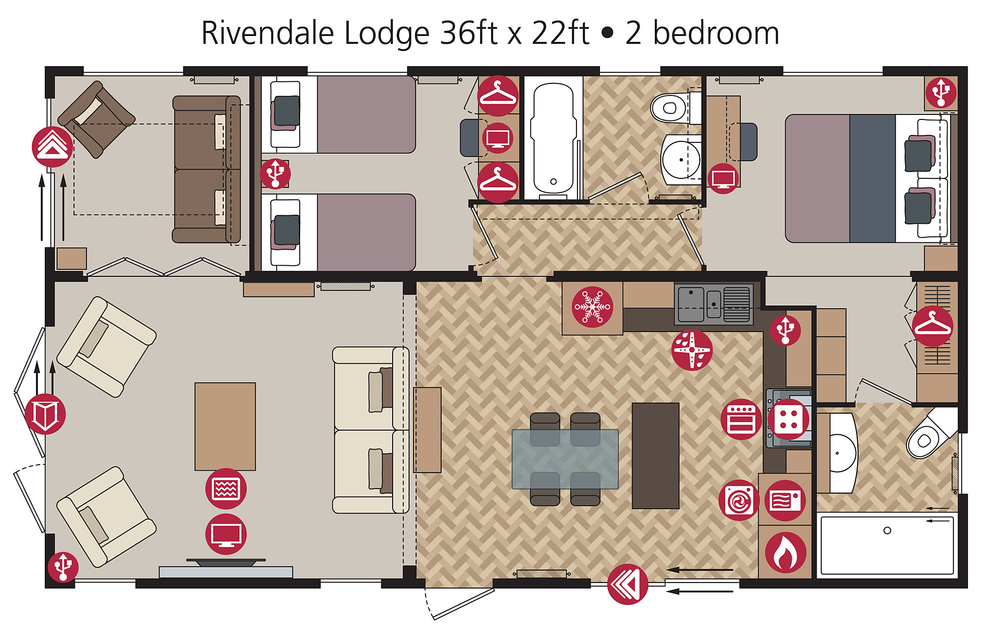 This brand new, fully-furnished Pemberton Rivendale (36'x20') luxury park home is perfect for those looking for a detached, easy to maintain, bungalow-style retirement property. The Rivendale is a classically styled park home with a traditional exterior and beautiful interior design. The open plan kitchen area features integrated appliances including, freestanding American-style fridge freezer, integrated cooker with separate oven and grill, kitchen island and glass top dining table.