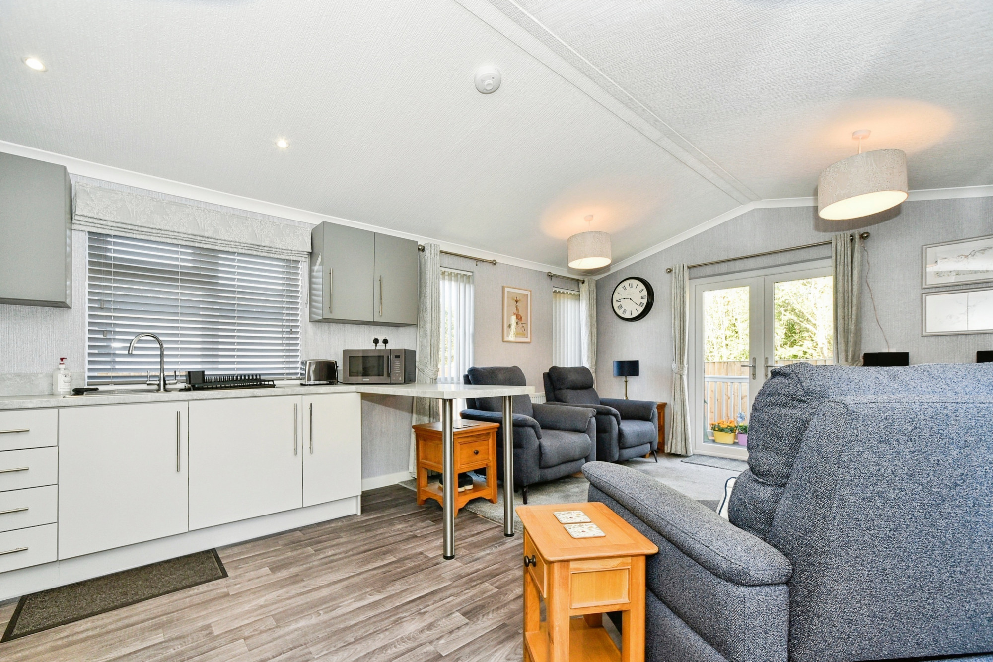 This pre-owned, modern Omar Newmarket (40'x14') luxury park home is perfect for those looking for a detached, easy to maintain, bungalow-style property. The home has an open plan kitchen, dining and living area, with integrated appliances and French doors leading out to the decking. The kitchen features a built-in fridge freezer and an eye level oven, washing machine and an induction hob with extractor fan. The home has a double bedroom with a built-in wardrobe, and second single bedroom with a built-in wardrobe and a shower room. The home has a Worcester Bosch boiler which will be having its annual service in September. All the vertical blinds, curtains, and light shades will be included in the sale.