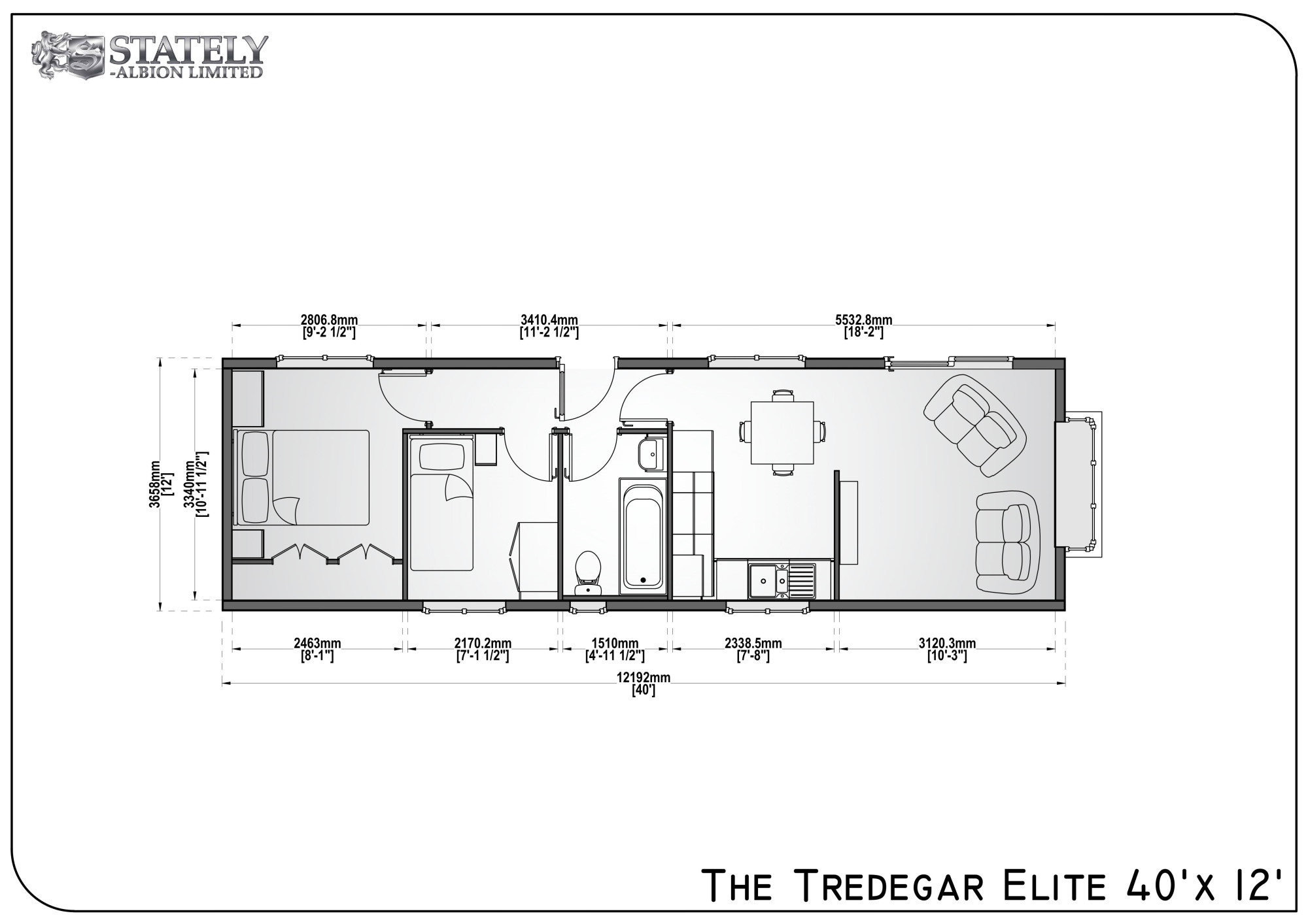This brand-new, modern-furnished Stately Tredegar Elite (42'x12') luxury park home is perfect for those looking for a detached, easy-to-maintain, bungalow-style property. The home has a kitchen with integrated appliances, dining area, and a comfortable living room with an electric fireplace. There are two bedrooms and a bathroom. The home also has a driveway.