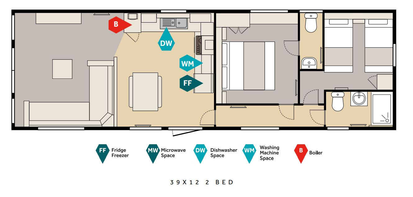 This brand-new, modern-furnished Victory Stonewood (39'x12') lodge is perfect for those looking for a detached, easy-to-maintain property. The lodge has an open plan kitchen with integrated appliances, dining area and lounge. There are two bedrooms and a bathroom.
